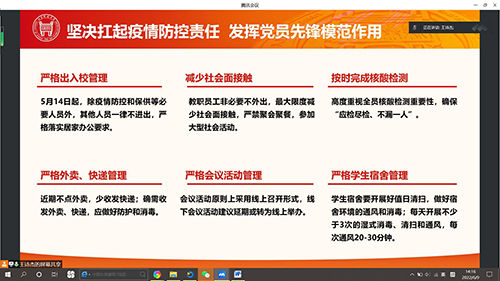 接着,传达学习学校近期关于从严从紧做好校园疫情防控工作的各项部署要求。党支部全体成员要坚决扛起疫情防控大旗,始终保持清醒的头脑和战略定力,严格做好行程管理、健康监测等基础工作。在校的党支部成员要严守出入校规定,尽量减少社会面接触,尽量减少外卖、快递的购买,按时完成核酸检测,自觉遵守学生宿舍相关管理规定,发挥党员先锋模范作用。