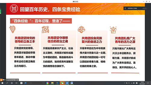 首先,深入学习贯彻习近平总书记在庆祝中国共产主义青年团成立100周年大会上的重要讲话精神。习近平总书记的重要讲话,全面回顾了100年来共青团坚定不移听党话、跟党走的青春历程,总结了四条宝贵经验,对共青团提出了四点希望。在中国共产党的坚强领导下,共青团不忘初心、牢记使命,走在青年前列,组织引导一代又一代青年坚定信念、紧跟党走,为争取民族独立、人民解放和实现国家富强、人民幸福贡献力量,谱写了中华民族伟大复兴进程中激昂的青春乐章。深入学习贯彻习近平总书记在中国人民大学考察时发表的重要讲话。习近平总书记进一步指明教育的根本问题,指明社会主义大学的办学方向,指明青年大学生成长成才方向,指明大学教师立德树人教书育人方向,指明思政课的要义,指明高校哲学社会科学研究方向。习近平总书记鼓励广大青年要做社会主义核心价值观的坚定信仰者、积极传播者、模范践行者,向英雄学习、向前辈学习、向榜样学习,争做堪当民族复兴重任的时代新人,在实现中华民族伟大复兴的时代洪流中踔厉奋发、勇毅前进。