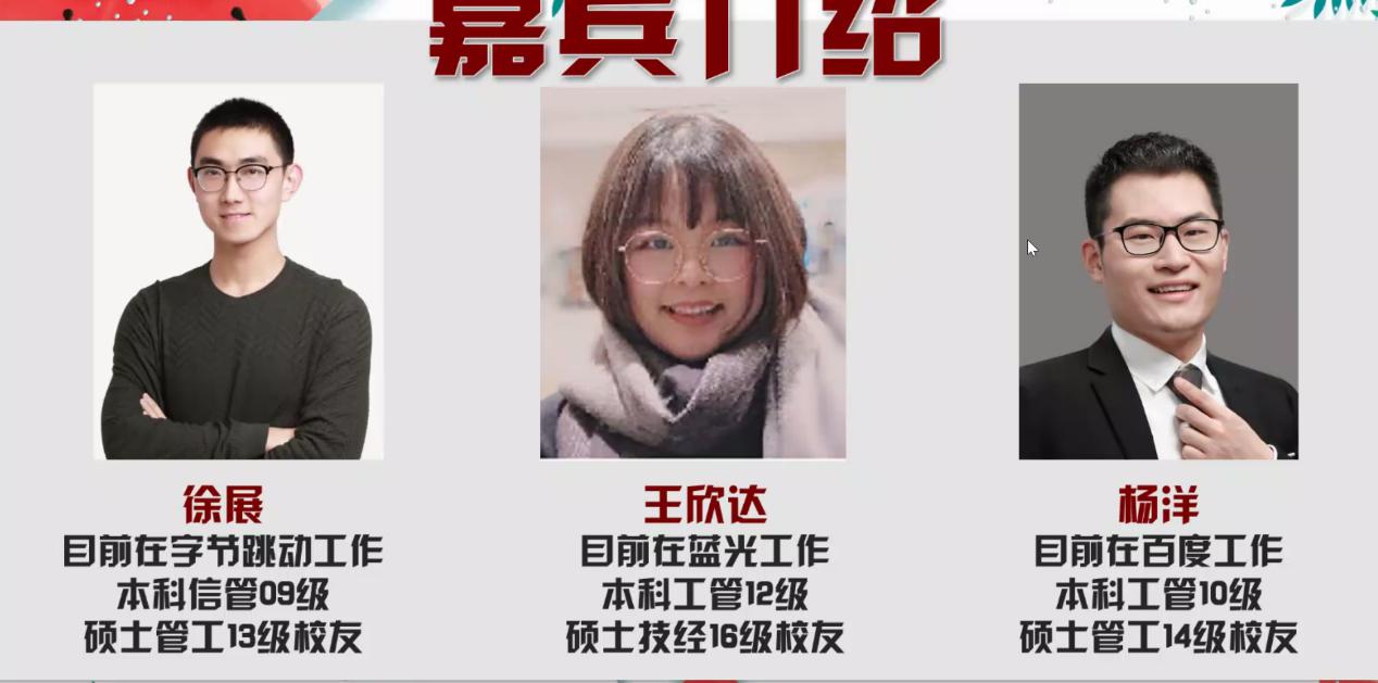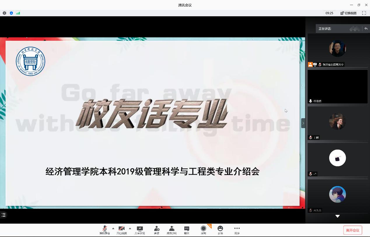 8月24日,伟德国际1946源于英国2019级管理科学与工程类专业介绍会于线上召开,会议由经管学院辅导员张洪榛主持,徐展校友,王欣达校友,杨洋校友受邀参加分享,2019级管理科学与工程大类学生及部分家长参会。