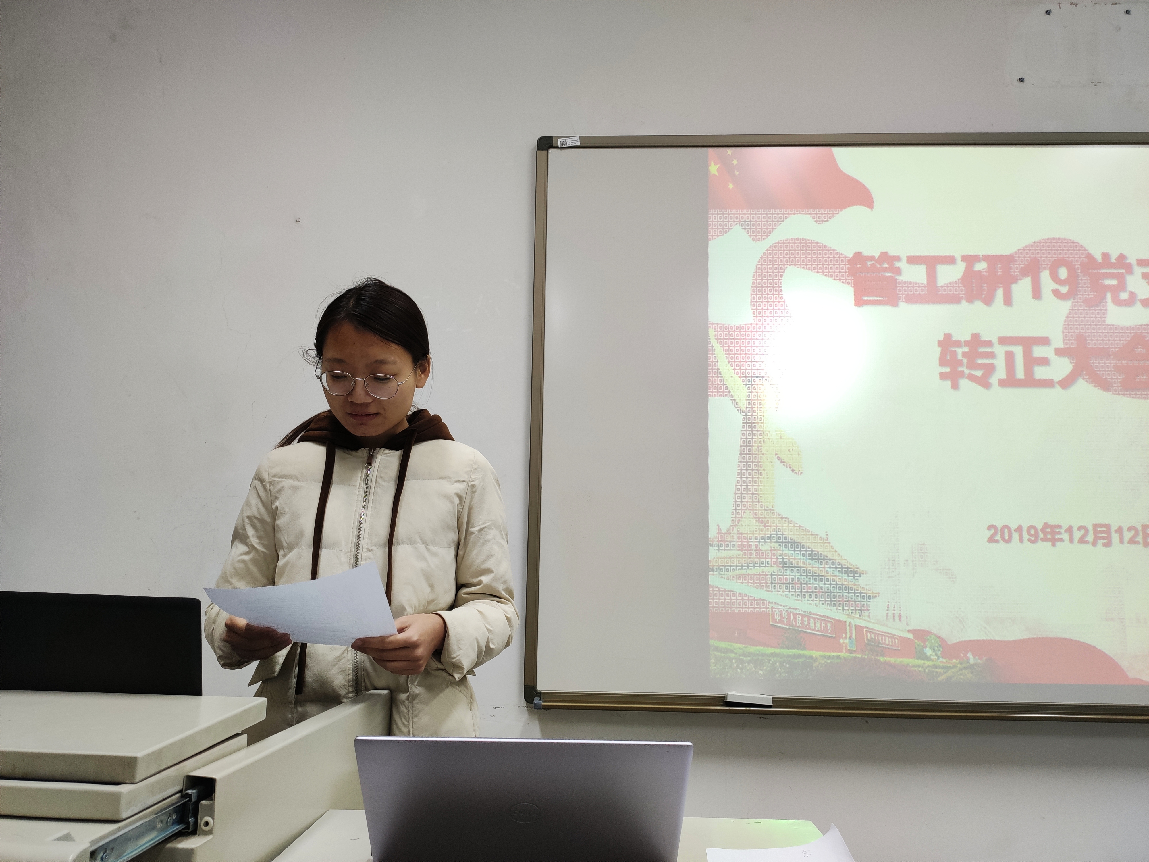12月12日,东凌伟德国际1946源于英国管工研19级党支部在管楼310顺利召开了中共预备党员转正大会暨“不忘初心、牢记使命”主题观影活动,党支部书记尹香婷主持本次活动。