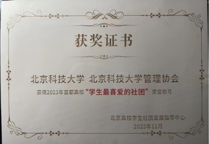 为深入学习贯彻习近平新时代中国特色社会主义思想,贯彻落实习近平总书记关于高校思想政治工作和青年工作的重要论述,切实加强学生社团建设管理,充分发挥学生社团育人功能,北京市学生联合会、北京高校学生社团发展指导中心联合开展了2023年“首都高校学生最喜爱的社团”评选活动。我校管理协会荣获2023年首都高校创新创业类“学生最喜爱的社团”荣誉称号。