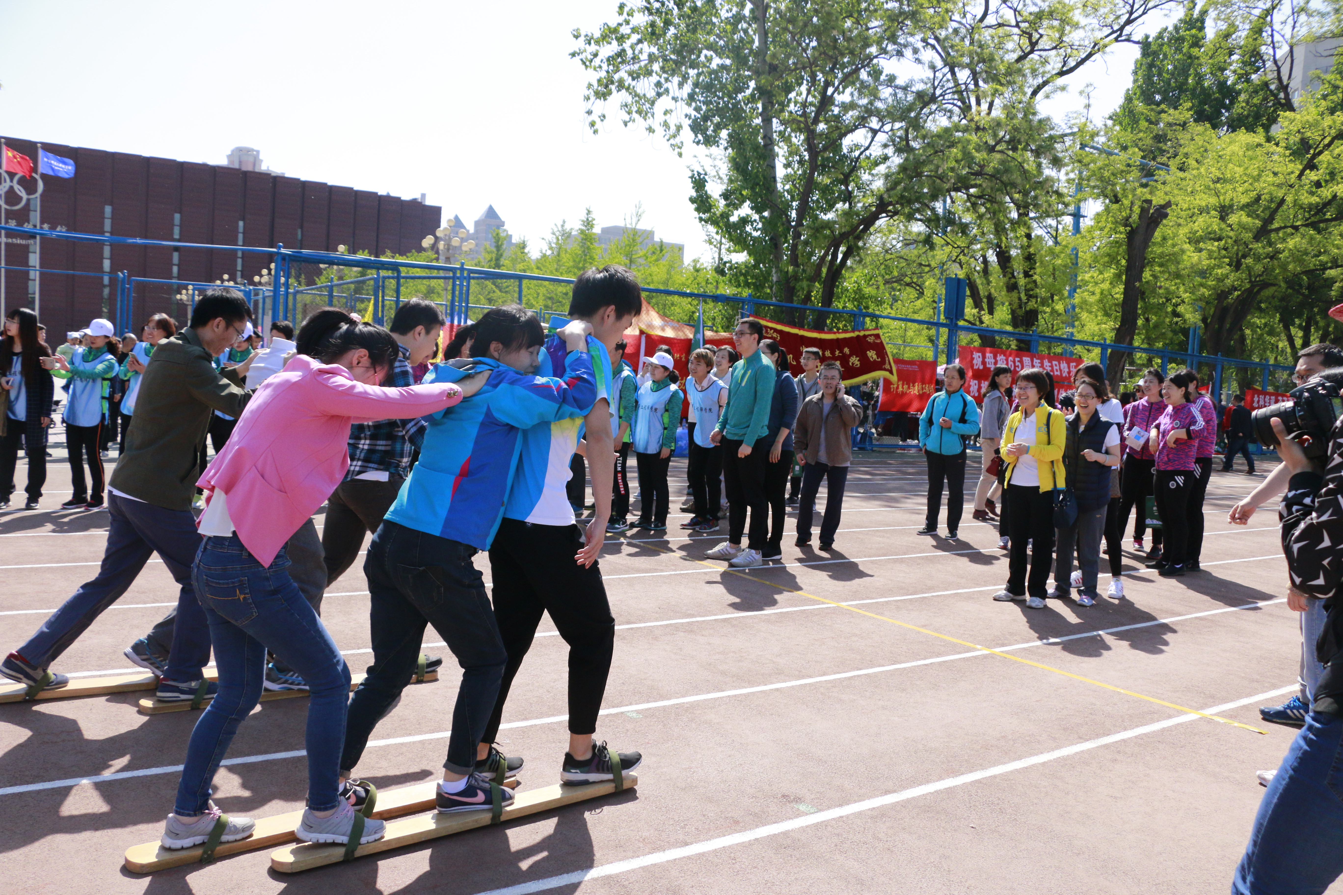 在教职工的赛场上,比赛内容丰富多样,老师们一改平日的严肃认真,呐喊着为自己的队友加油,正在比赛的老师也奋力拼搏,使出浑身解数,挥洒汗水,感受青春与活力。
